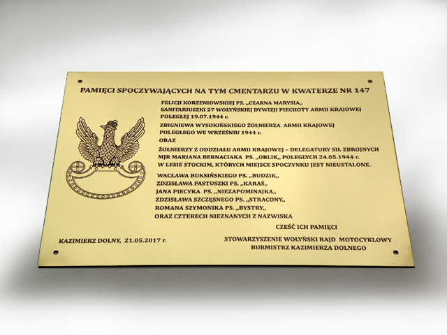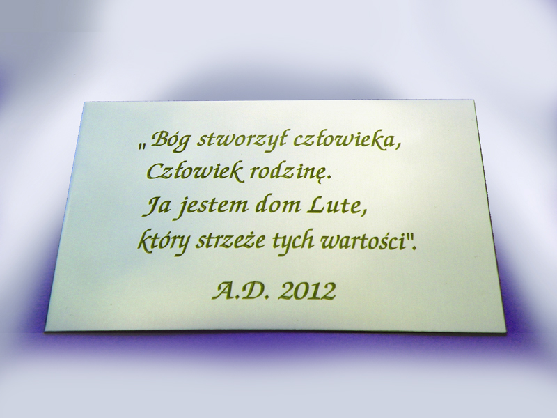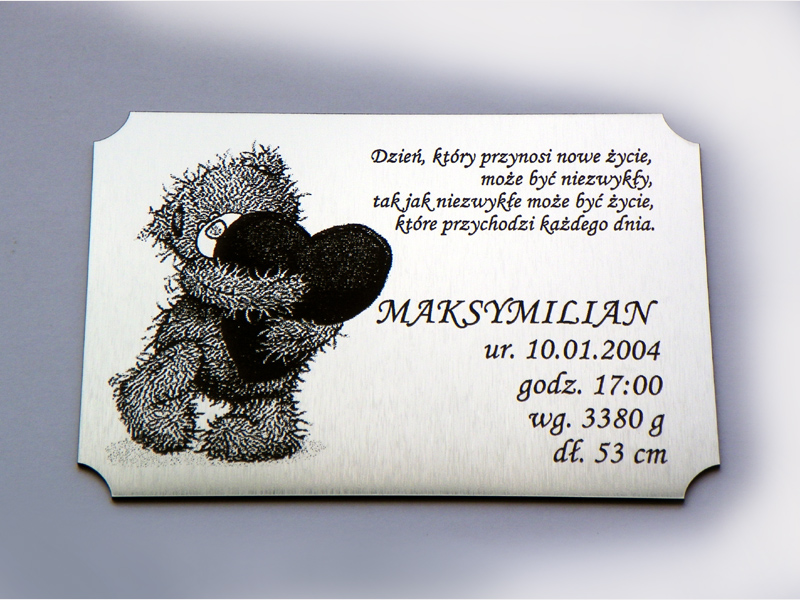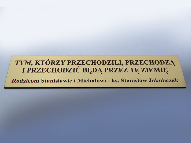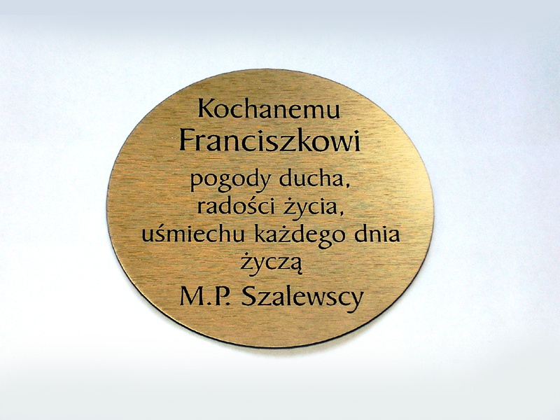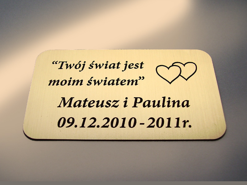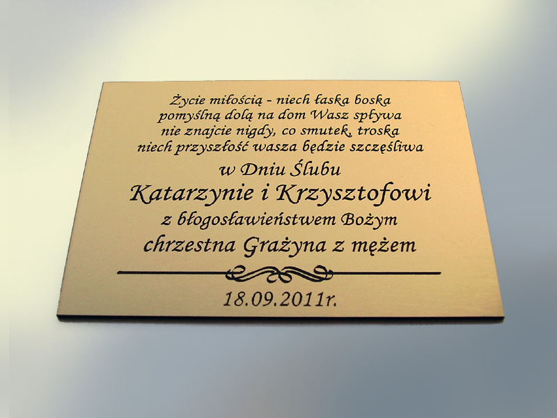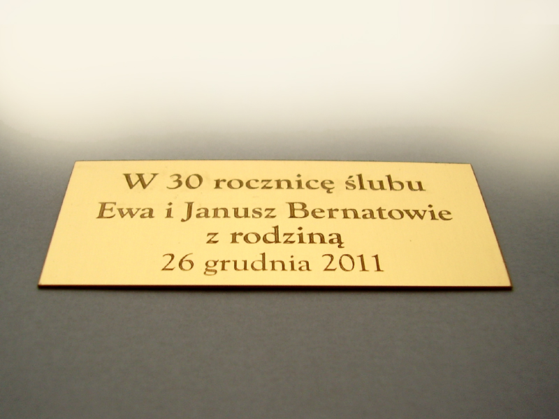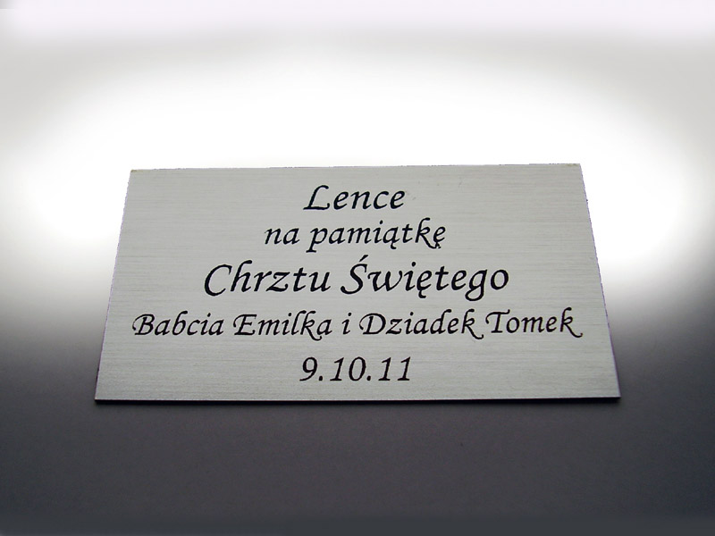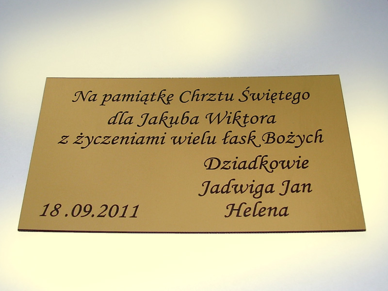 Tabliczki okolicznościowe mogą stanowić samoistny prezent lub być uzupełnieniem ofiarowywanego przedmiotu. Wykonane z laminatu grawerskiego, blachy pokrytej warstwą poliestru lubz blachy mosiężnej. Zapomocą tych metod jesteśmy w stanie wykonać tabliczki okolicznośiowe na różne okazje. polecamy tabliczki na chrzest, tabliczki na komunię, tabliczki z okazji rocznicy ślubu czy tabliczki dla nowożeńców.